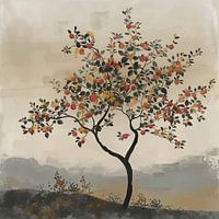 Natuur Schilderij | Fruity Whimsy - Dit natuur schilderij toont een schilderachtige boom, rijkelijk gedecoreerd met bladeren en vruchten die een kleurrijk spektakel bieden van rood, oranje en goud tegen een zachte, minimalistische achtergrond. De boom, met zijn elegante zwarte stam en vertakkingen, staat centraal op het doek. Hij is…