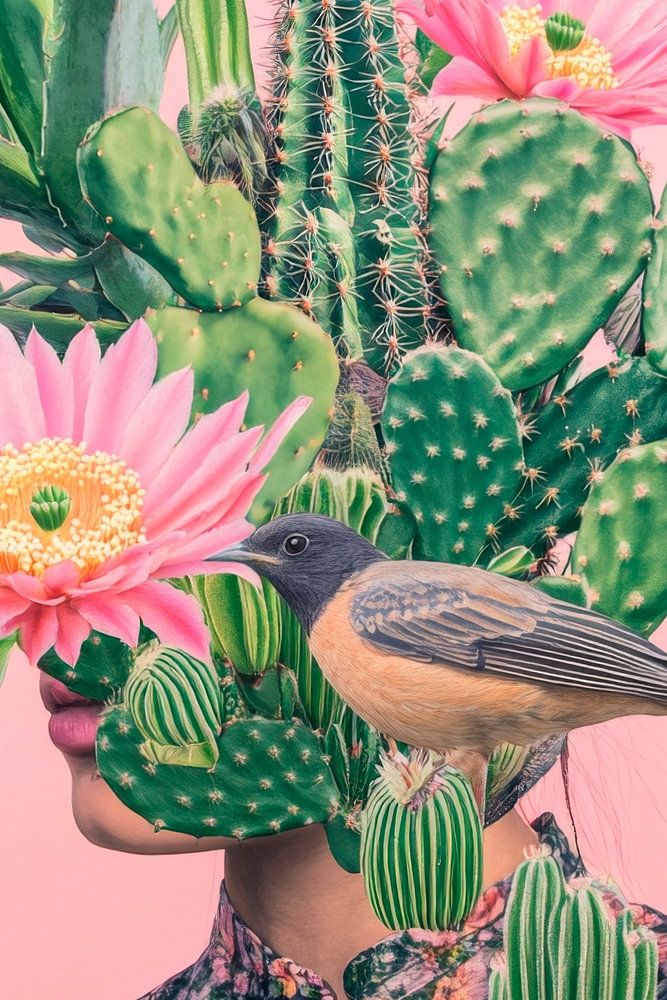 Hier ontvouwt zich een fascinerende samensmelting van mens en natuur: Een hoofd van weelderige cactussen en heldere bloemen, waardoor de grens tussen waakzaamheid en plantkunde vervaagt. Zachtjes omarmd door een vogel straalt de foto een surrealistische schoonheid en levensvreugde uit, terwijl de zachtroze achtergrond het geheel harmonieus afrondt.