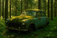 Een verweerde vintage auto, overgroeid met mos en omringd door een weelderig bos, symboliseert de kracht van de natuur die langzaam alles terugneemt. Dit sfeervolle beeld vertelt een poëtisch verhaal van vergankelijkheid en herovering.