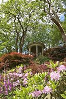 Foto van een natuurlandschap op landgoed Twickel in Delden. Te zien is een prieel temidden van prachtige bomen die afsteken tegen de blauwe lucht. Op de voorgrond diverse flora zoals de rhodedenderon. Kleurstelling groen, roze, rood. Natuurfotografie.