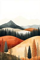 Een sereen berglandschap in warme aardetinten, waar dennenbossen en kale heuvels elkaar afwisselen in een harmonisch samenspel. De compositie toont een minimalistische interpretatie van de natuur, met vloeiende lijnen en zachte kleurovergangen van terracotta en beige naar diepgroen, wat resulteert in een rustgevende, moderne illustratie…