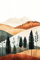 Een sereen landschap in warme aardetinten waar dennenbomen als wachters in de vallei staan. De compositie toont een gelaagd berglandschap met een spel van zachte heuvels in verschillende hoogtes, waarbij de kleuren variëren van diep terracotta tot rustig groen. De minimalistische stijl en het gebruik van organische vormen creëert een moderne, rustgevende interpretatie van een natuurlijk berglandschap.