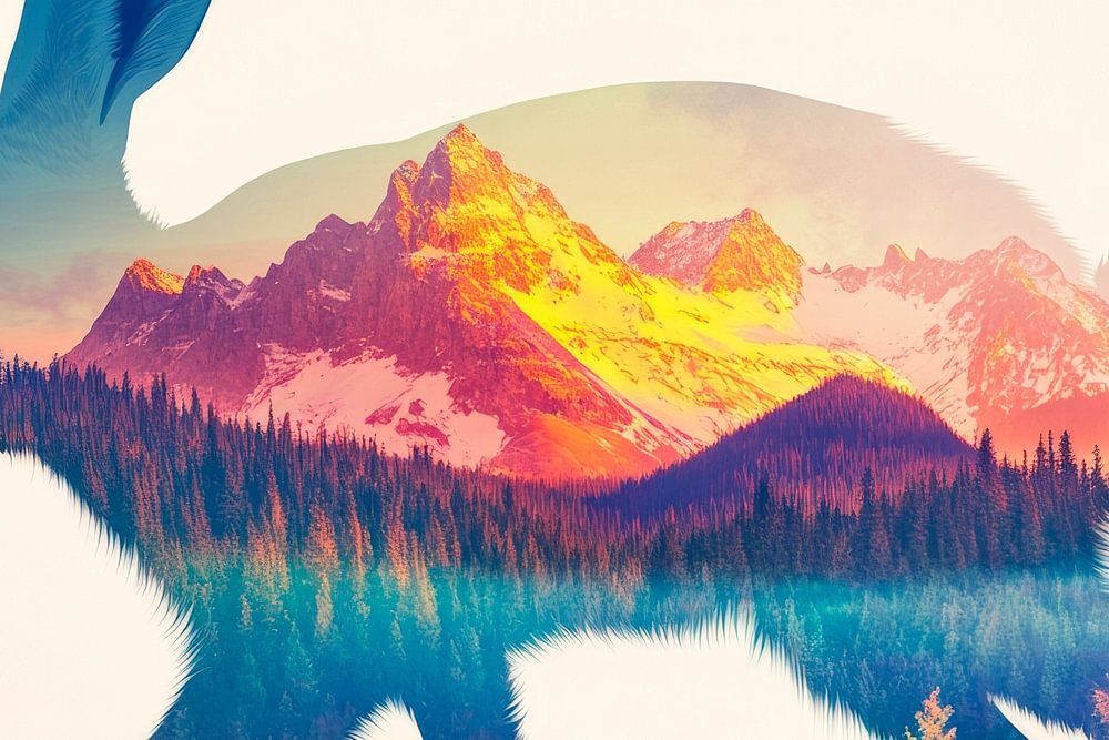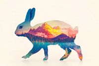 Een fascinerend samenspel van natuur en dier: de haas danst door majestueuze bergen en weelderige bossen, zijn silhouet afgewisseld met levendige kleuren. Dit artistieke meesterwerk brengt levenslust en een harmonieuze band met de natuur in elke woonkamer en is tegelijkertijd een inspirerende blikvanger.