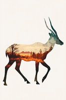 Een majestueus silhouet van een antilope versmelt harmonieus met een schilderachtig landschap van glooiende heuvels en gouden schemering. Deze creatieve voorstelling brengt de vrijheid van de natuur in huis en is perfect voor de woonkamer, waar het als blikvanger inspiratie en rust uitstraalt. Een combinatie van wilde dieren en landschap die uitnodigt om te dromen.