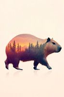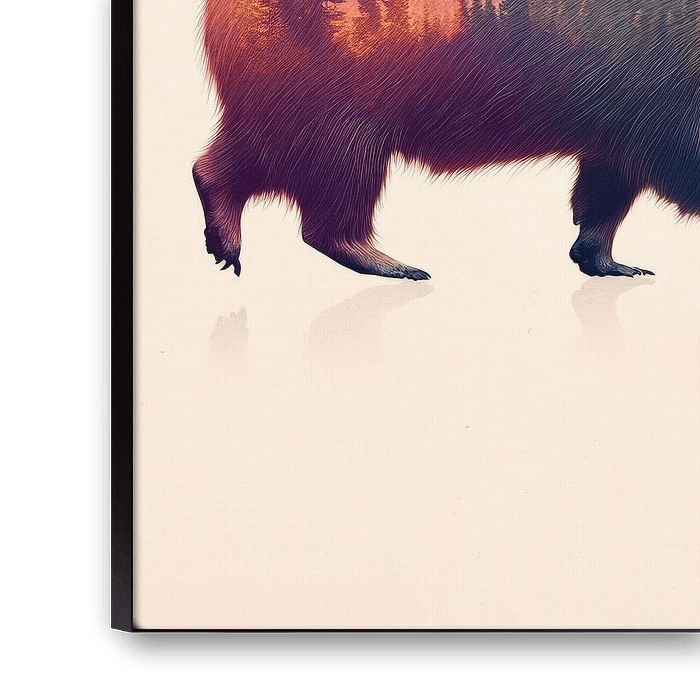 Een zachte overgang tussen de natuur en de dierenwereld: een pluizige metgezel, gehuld in de levendige kleuren van een zonsondergang, wandelt door een weelderig boslandschap. Deze harmonieuze compositie geeft elke kamer, vooral de woonkamer, een rustgevende en inspirerende sfeer die uitnodigt om te dromen en te ontspannen.
