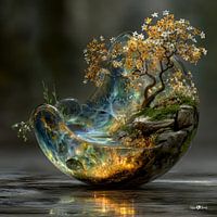 Een krachtige, sierlijk gevormde boom lijkt te groeien uit een wereld die tegelijkertijd tastbaar en ongrijpbaar is.
