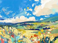 Natuur landschap | Kleurrijk landschap - In dit landschap schilderij zie je een kleurrijk uitzicht met glooiende heuvels, heldere bloemen en een stralende blauwe lucht vol wolken, wat de schoonheid van de natuur vastlegt.