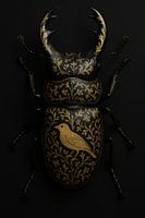 Deze kever is geen gewoon insect, maar een kunstwerk op zich: zijn glanzende pantser is rijkelijk versierd met gouden bloemmotieven en een vogel, alsof hij uit een koninklijk porseleinwerk is ontsnapt. Een krachtig en stijlvol eerbetoon aan de schoonheid van de natuur in luxueuze detaillering.