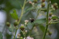 Een hommel / bij vliegend van bloem naar bloem.