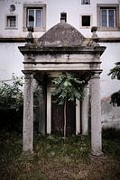 Vervallen gebouw in Portugal wordt overwoekerd door planten. Urbex in Evora Portugal. Boompje onder ingang gebouw