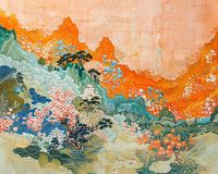 Natuurlandschap - Dit landschapsschilderij toont een levendige, kleurrijke weergave van bergachtige natuur met opvallende oranje tinten en gedetailleerde bloemen.