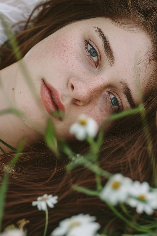 In het midden van een zachte weide ligt een meisje met helderblauwe ogen, omringd door tere madeliefjes. Haar opvallende, rode krullen vallen op het groene gras, terwijl haar luchtige, gehaakte topje een romantisch tintje toevoegt. De kalme uitdrukking op haar gezicht straalt een vredige sereniteit uit die de kijker meteen betovert.