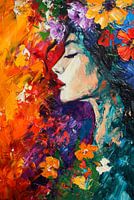 Dit levendige kunstwerk vangt de essentie van een vrouw, gehuld in de warmte van herfstkleuren en de levendigheid van een bloeiend veld.