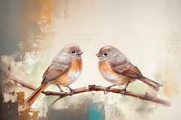 Koop dit schilderij Natuurlijk Vogel Stilleven. Twee vogeltjes op een tak. Aardse tinten. van Studio Pieternel als reproductie op canvas, aluminium dibond, (ingelijste) fotoprint, behang en ArtFrame, op maat geprint in Fine-Art kwaliteit.