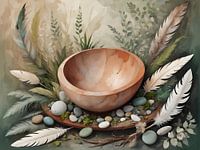 Deze compositie brengt een harmonieuze combinatie van natuurlijke elementen samen. Centraal staat een gladde, houten kom, met daaromheen zorgvuldig geplaatste veren, stenen en mos. De kleuren zijn zacht en rustgevend, variërend van aardetinten tot subtiele groene en blauwe tinten. De keuze voor veren en natuurlijke materialen roept een…