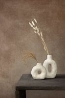 Sober, natuurlijk stilleven met rietpluimen in 2 witte, porseleinen vazen. Het geheel staat op een oude, steigerhouten tafel. Het is een rustgevend beeld met natuurlijke kleuren. Er is mooie zachte lichtinval vanuit een raam en mooie schaduwen. Droogbloemen worden steeds meer gebruikt als decoratie in huis, maar ook als wanddecoratie een sieraad in huis. Extra mooi om dit werk te combineren met mijn andere stilleven foto's.