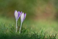 Een prachtig natuurlijk stilleven met lila krokussen onder de dauwdruppels. Krokussen zijn echte lente bloeiers die al vroeg in het voorjaar bloeien. Het zijn daarom ook echte lentebodes.