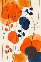Opvallende oranje en donkerblauwe tinten worden afgewisseld met subtiele lijnen die een gevoel van bloemen en bladeren suggereren. De vlekken en streken zijn speels en intuïtief geplaatst, wat het werk een…