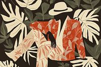 De silhouet van de man is bruinzwart, wat prachtig contrasteert met de lichte kleuren van zijn kleding. Deze keuze benadrukt zijn aanwezigheid en geeft diepte aan de afbeelding. Op de achtergrond zien we grote, witte en groene junglebladeren die de tropische sfeer versterken. Ze creëren een weelderige omgeving, waardoor de man helemaal tot zijn recht komt en de verbinding met de natuur benadrukt.