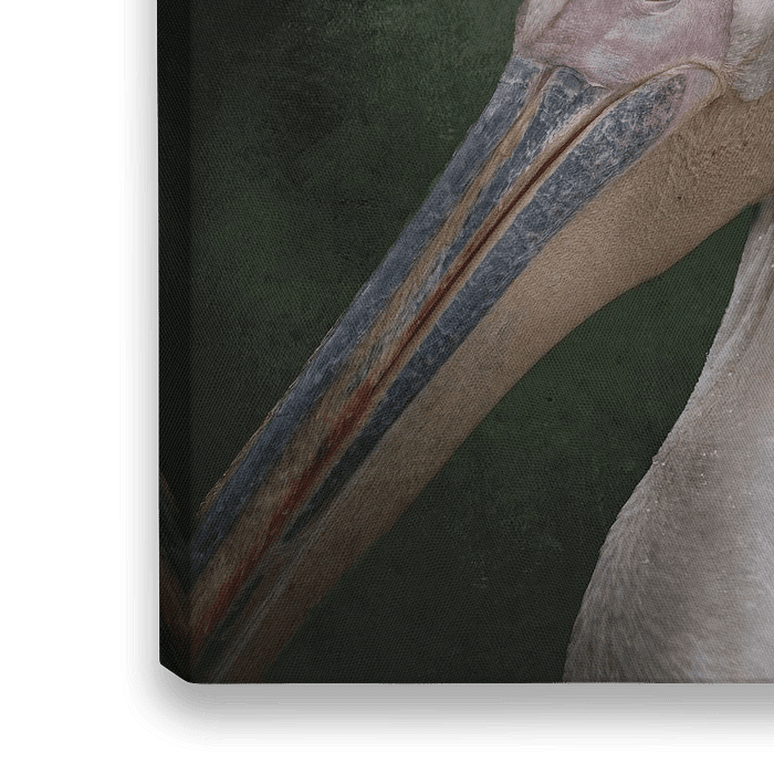 Dit verfijnde portret vangt de essentie van een pelikaan, met een nadruk op zijn sierlijke lijnen en textuur. De diepe groene achtergrond versterkt de natuurlijke uitstraling en schept een harmonieus contrast met de zachte witheid van het verenkleed. De rijke details van de snavel en de subtiele schaduwen voegen een gevoel van diepte en…