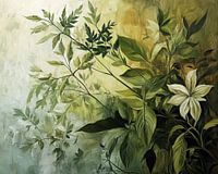 Natuurlijke Schoonheid op Canvas - Dit planten schilderij toont een levendige compositie van groene bladeren en witte bloemen op een zacht, abstracte achtergrond van geel en groentinten, wat een gevoel van natuurlijke rust en groei uitstraalt.