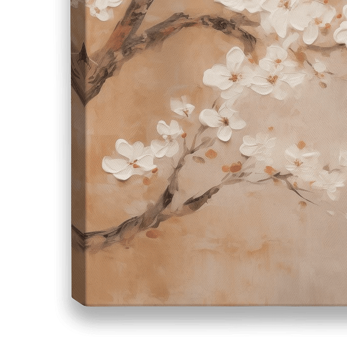 Een schilderij van witte kersenbloesems tegen een beige bruine achtergrond, met levendige oranje spatten, roept een dynamische en expressieve scène op. Het contrast tussen de zachte, etherische witte bloesems en de warme, aardse achtergrond wordt versterkt door de opvallende oranje accenten, waardoor een levendige balans in de…