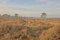 Op dit werk zie je een uitgestrekt heidelandschap, badend in zacht ochtend- of avondlicht. De warme tinten van gras en heide vullen het beeld, terwijl een omgevallen boom met verweerde takken als stille blikvanger in het midden ligt. Op de achtergrond staan enkele solitaire bomen, licht gehuld in nevel. Tussen…