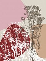 De delicate takken, weergegeven in contrasterend bruin en wit, zorgen voor een speels diepte-effect, terwijl de abstracte achtergrondelementen in beige, rose en donkerrood een kalmerende sfeer oproepen. Dit stuk past moeiteloos in diverse interieurs, van Scandinavisch tot boho-chic, en brengt een vleugje natuurlijke verfijning in elke ruimte.