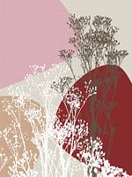 De delicate takken, weergegeven in contrasterend bruin en wit, zorgen voor een speels diepte-effect, terwijl de abstracte achtergrondelementen in beige, rose en donkerrood een kalmerende sfeer oproepen. Dit stuk past moeiteloos in diverse interieurs, van Scandinavisch tot boho-chic, en brengt een vleugje natuurlijke verfijning in elke ruimte.