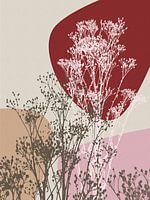 De delicate takken, weergegeven in contrasterend bruin en wit, zorgen voor een speels diepte-effect, terwijl de abstracte achtergrondelementen in beige, rose en donkerrood een kalmerende sfeer oproepen. Dit stuk past moeiteloos in diverse interieurs, van Scandinavisch tot boho-chic, en brengt een vleugje natuurlijke verfijning in elke ruimte.