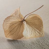 Doordat het hortensiablaadje gedroogd is door het zonnetje, is het blaadje dun geworden. Hierdoor kan er makkelijk licht doorheen komen en zijn de nerven nu goed te zien. Deze nervenstructuur geeft een hele mooie natuurlijke tekening aan het blad. De zachte serene neutrale kleuren geven een rustige sfeer aan dit stilleven. Een landelijk sfeertje waar zowel het blaadje als het hout voor zorgt. Dit werk heb ik bijgesneden tot een vierkant, zodat het blad mooi centraal kan staan in dit werk.