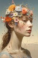 Een mooie vrouw, met takjes en bloemetjes als een aureool rond haar hoofd en op haar schouders, heeft een pure natuurlijke uitstraling zonder invloeden van buitenaf. Wat je ziet is wat je krijgt. Het beeld is met behulp van ai gegenereerd.