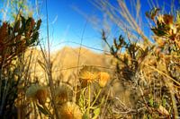 In het Naukluft gebergte wordt getrakteerd op een mooi kleurenspel door de begroeiing en opkomende zon.