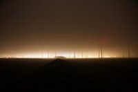 Windmolens in de mist. Het licht vanachter is de haven van Antwerpen. Genomen bij de grens tussen Nederland en België.