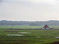 Groene weide met een kleine boerderij, achter de boerderij zie je de duinen van Hargen aan zee verhuuld in de mist.
