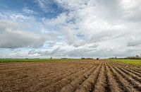 Hollands agrarisch landschap met aardappelruggen. Het blad van het gewas is verdord en de oogst kan beginnen. De aardappelrooier is al gearriveerd. Het is een bewolkte dag aan het begin van het herfstseizoen. De foto is gemaakt nabij het kleine Nederlandse dorpje Dreischor op het eiland Schouwen-Duiveland, provincie Zeeland.