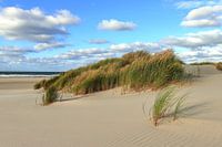 Heel herkenbaar Nederlands duinlandschap: breed strand, witte schuimkoppen van de branding, en op de voorgrond een gedeeltelijk begroeid zandduin met bloeiend helmgras. De witte wolken in de blauwe lucht geven het landschap een vriendelijke uitstraling.