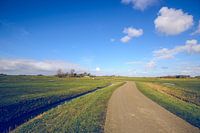 Wijds uitzicht op Nederlands polder landschap op het eiland Texel. in Nederland. Weilanden, schapen en wolkenluchten tegen de achtergrond van het waddengebied.