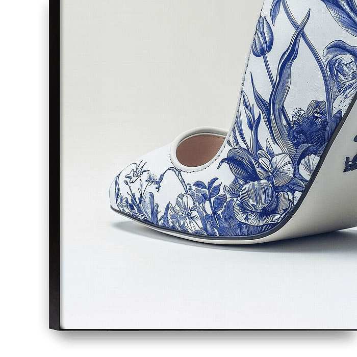 Witte pump schoen voorzien van Delfts blauwe tekeningen van tulpen tegen witte achtergrond