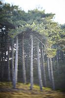 Nederlandse bos in de duinen gefotografeerd bij Parnassia tijdens zonsopkomst. Gouden uur, zonsopkomst. Gouden bomen, zonlicht, tilt-shift effect, abstracte onscherpte. Mooi tegenlicht in het bos middenin de nederlandse natuur. Een landschapsfoto van een mooi bos. Scherpte verloop. Sprookjes bos