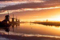 Windmolens in een zonsopgang bij Kinderdijk in Nederland, genomen op een koude ochtend in december