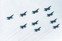 Nederlandse F16 vliegtuigen in formatie in volle vlucht boven Nederland.
