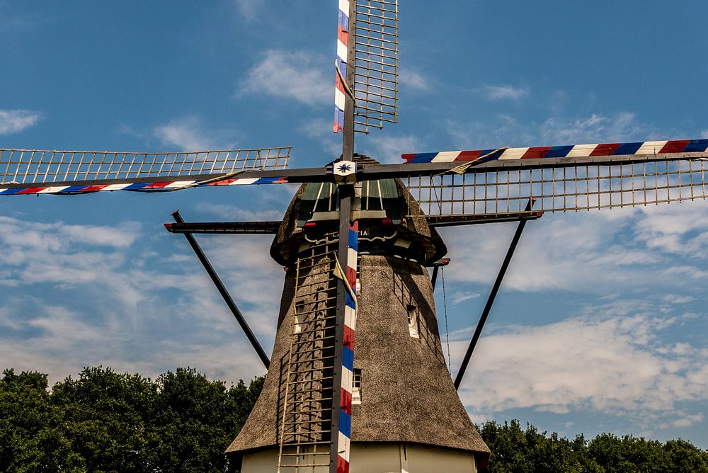 typische Nederlandse Windmolen met de vlag kleuren op de wieken.