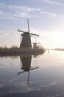 Kleurenopname van de windmolens in Kinderdijk met een spiegeling in het water.