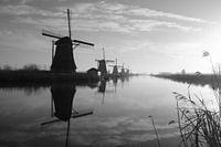 Zwart wit opname van de windmolens in Kinderdijk met een spiegeling in het water.