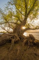 Langs de rivier een prachtige boom waar het wortelstelsel opvallend boven de grond uitsteekt. Deze boomwortels worden ook wel mangrove genoemd.
