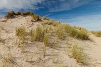 Zicht op de Nederlandse duinen met het helmgras en de mooie Nederlandse wolken luchten boven zee.