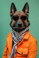 Met zijn imposante gestalte en zelfverzekerde blik zal de Nederlandse herder elke kamer oplichten. De stijlvolle zonnebril en modieuze oranje jas geven hem een vleugje koelte, terwijl de elegante sjaal zijn charmante uitstraling benadrukt. Een echt fashion statement in het hondenuniversum!