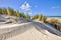 Nederlandse kust in beeld. Het duin met zijn wuivende helmgras biedt een sereen tafereel, waar de kustlijn van de Noordzee zich uitstrekt tot aan de horizon. Het zachte zand vormt glooiende heuvels die bedekt zijn met het karakteristieke gras, dat zijn wortels diep in de duinen verankert. Terwijl de wind het helmgras laat dansen, strekt de zee zich uit als een eindeloze blauwe vlakte, glinsterend onder de stralende zon. Het geluid van de golven, gesteund door de zilte geur van de zee, creëert een atmosfeer van rust en verwondering. Het duin met helmgras biedt een perfect uitkijkpunt om te genieten van het spektakel van de natuur, waar de kracht van de zee en de sereniteit van het land samenkomen in perfecte harmonie. Dit is een plek waar de tijd lijkt stil te staan, en waar de schoonheid van de natuur in al haar glorie wordt gevierd.