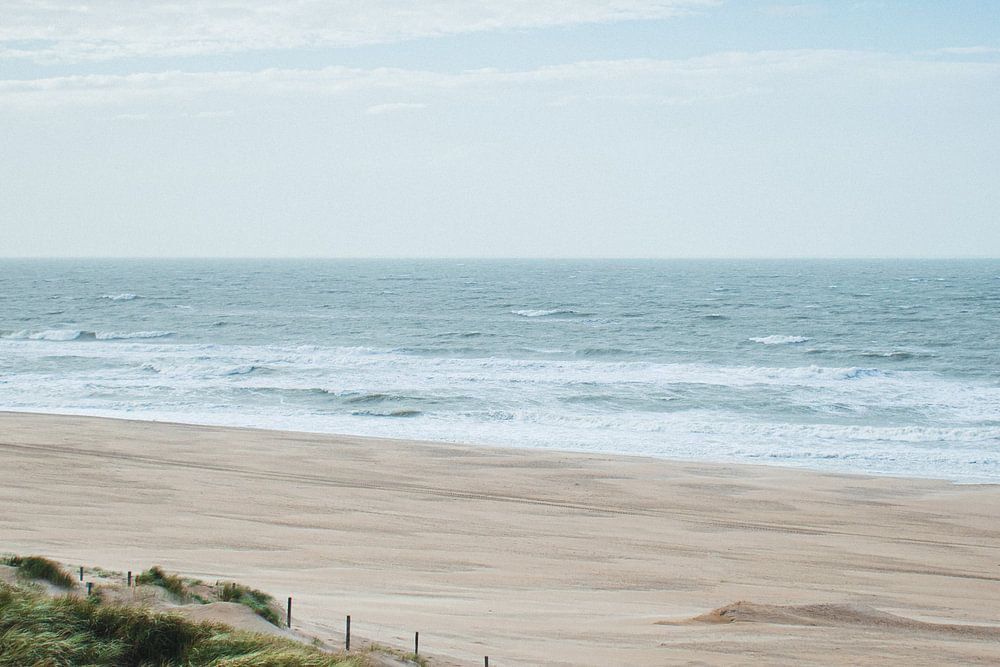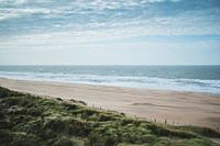 Prachtig beeld van de Nederlandse kust (bij Den Haag) met de duinen en het strand op de voorgrond. De blauwe zee en blauwe lucht lijken in elkaar over te gaan.